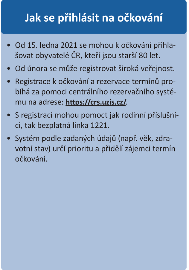 - Od 15. ledna 2021 se mohou k očkování přihlašovat obyvatelé ČR, kteří jsou starší 80 let.