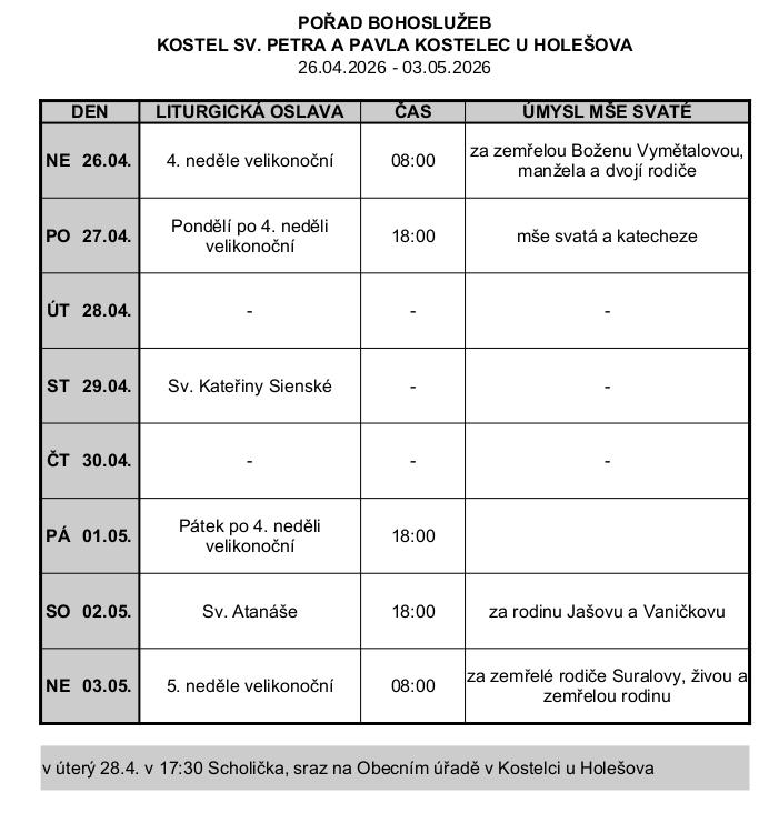 | Sobota | 17:30 | 18:00 |